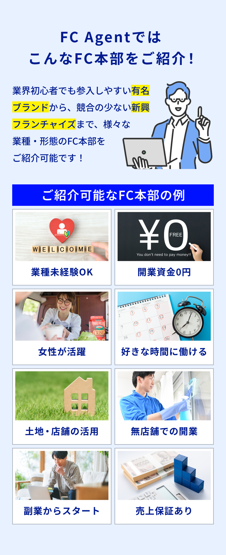 FC Agentでは400社以上の本部をご紹介可能です。どんな条件でも最適な本部をご紹介いたします。